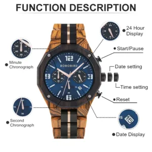 Eco-Friendly Natural Wood Design: Crafted from eco-conscious natural wood, this watch showcases a distinctive and environmentally-friendly aesthetic;